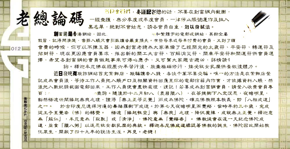 012期:六合皇金句/老总论码/萧公子/林大师/五行夺码/老总信箱截图