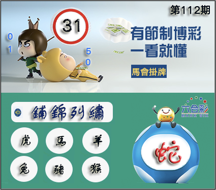 112期正版彩图挂:31 爆:蛇 挂牌成语:铺锦列绣 挂牌出肖:虎马羊兔猪猴